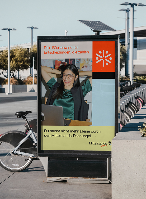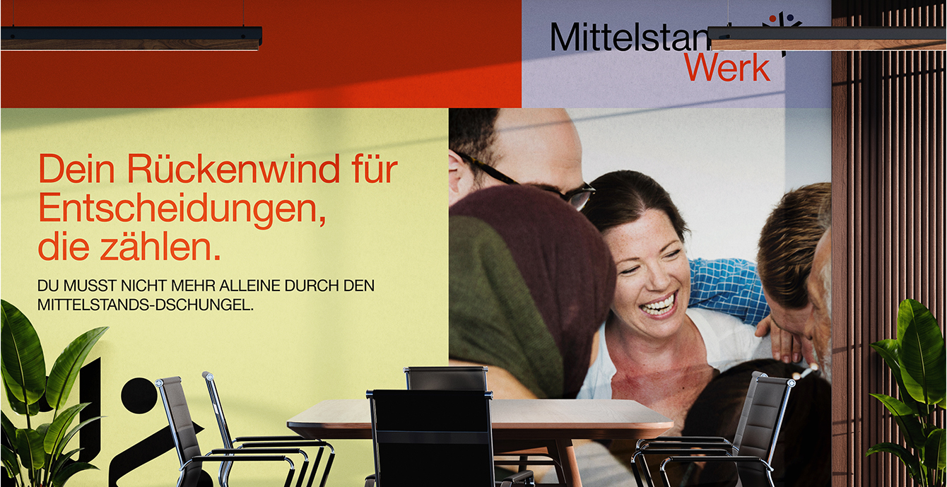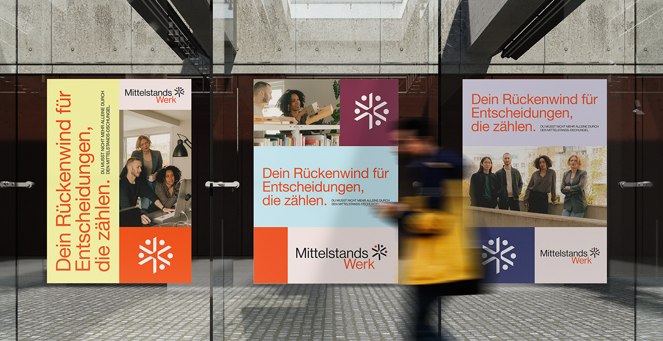 Through workshop-style sessions, we identified MittelstandsWerk’s core values and explored how to connect the individual business units into a coherent brand architecture. Our strategy focused on placing people at the center of the design, reflecting their personalized consulting approach. The resulting identity is bold, modern, and functional, with visual cues that allow each service area to stand out while remaining part of a unified brand system.